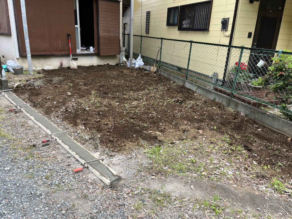 - 駐車場の土の整地:植木の抜根と土の整地を行い、次回の砕石敷きに備える。