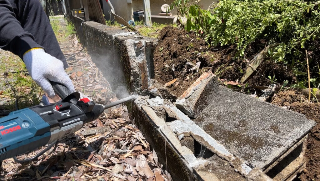 - ブロック塀の解体:ハンマードリルを使用し、つなぎ目の部分にドリルを当てて解体。サンダーで切り込みを入れた部分は保護。