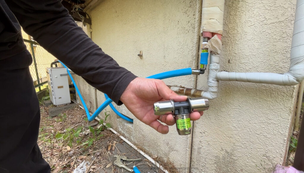 - 1号物件では給水管の接続を行ったが、配管には苦労した。