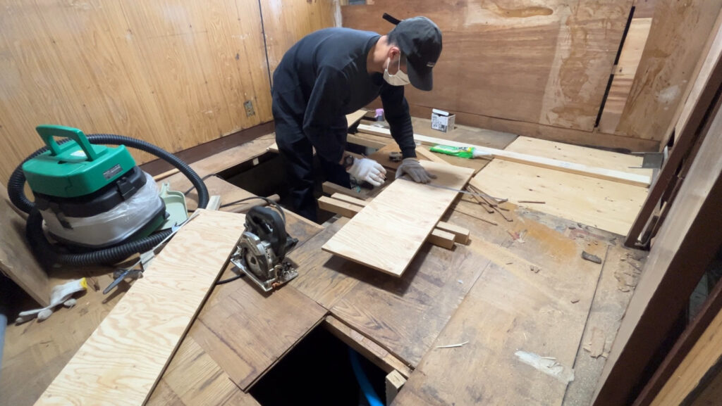 - 便器を外し、床のシートを剥がしてからきれいに掃除をし、ベニアを貼った。今回は9ミリの合板を接着剤とビスを使って固定した